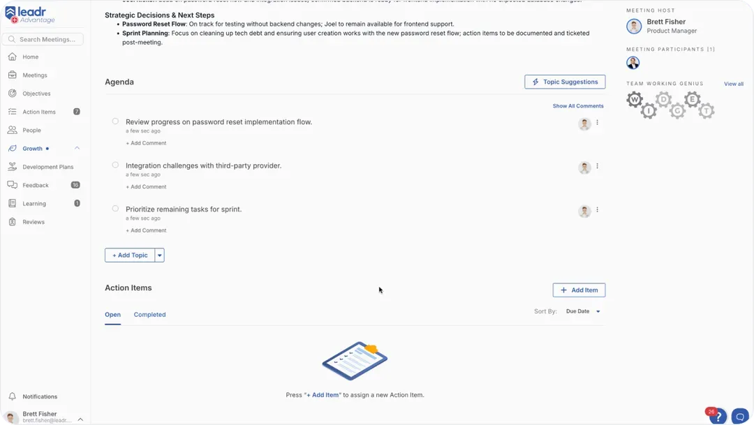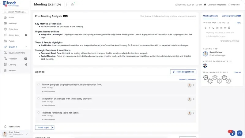 - Accountability without micromanagement — Action items are seamlessly captured with clear ownership.